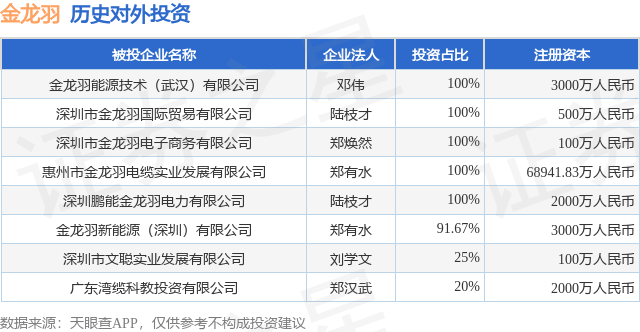 本站消息,根据天眼查APP显示财盈策略,金龙羽(002882.SZ)新增一起对外投资事件,被投资公司为金龙羽能源技术(武汉)有限公司,法定代表人邓伟,投资占比为100%。该公司从事研究和试验发展,注册资本为3000万人民币。目前,金龙羽共存在对外投资8项,详见下表: