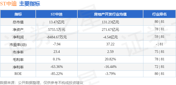 ST中迪主要指标及行业内排名如下: